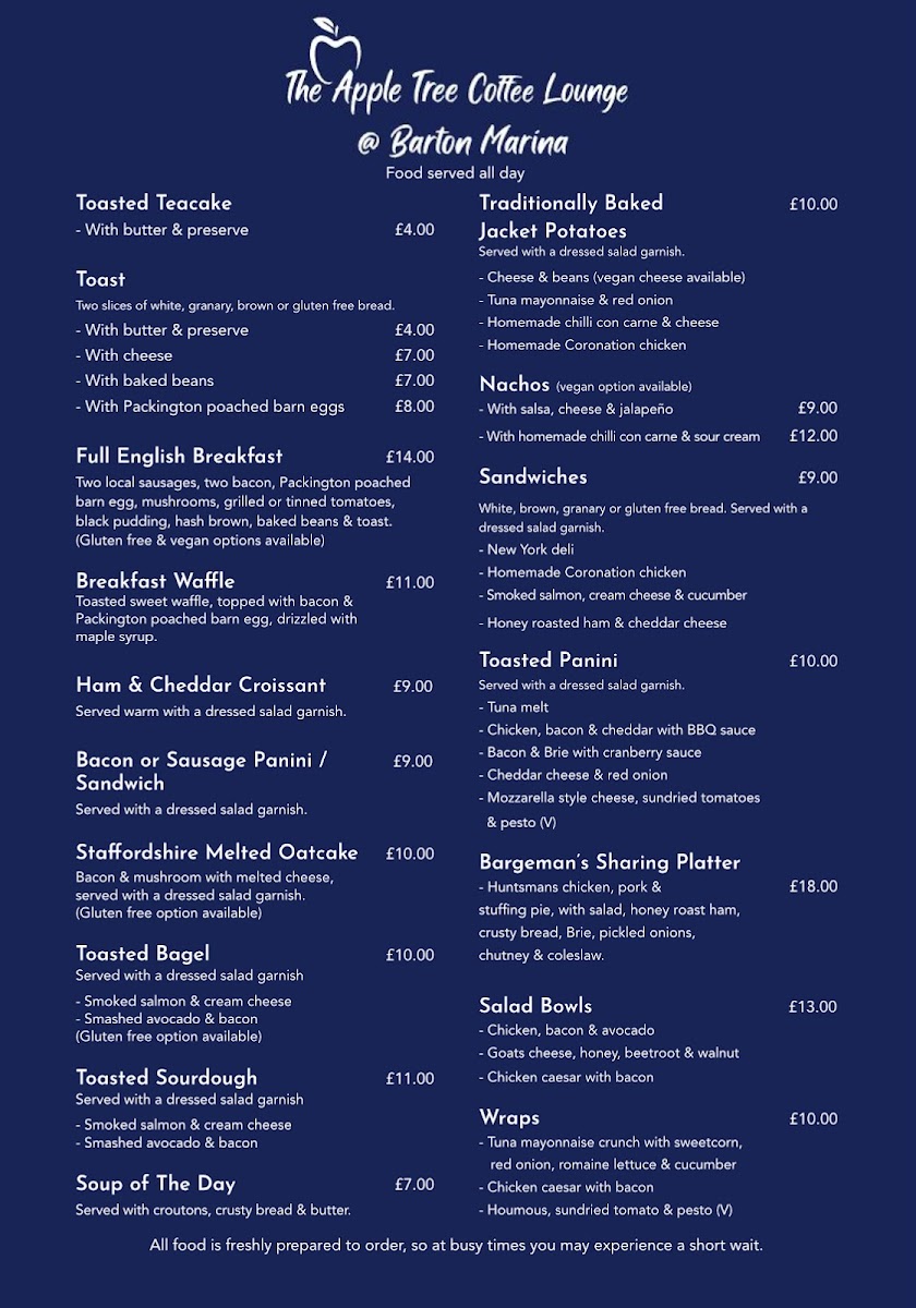 Welcome to The Apple Tree Coffee Lounge, nestled in the picturesque Barton Marina in Burton-on-Trent. This cozy spot is a haven for those seeking comfort and warmth, matched only by the friendly greetings of its staff. The menu is a delightful journey through flavors. Start with refreshing Kopparberg cider or the comforting Hot Spiced Apple drink. For light bites, don't miss the Huntsman Pie and Mini Nachos, perfect companions to the inviting atmosphere.